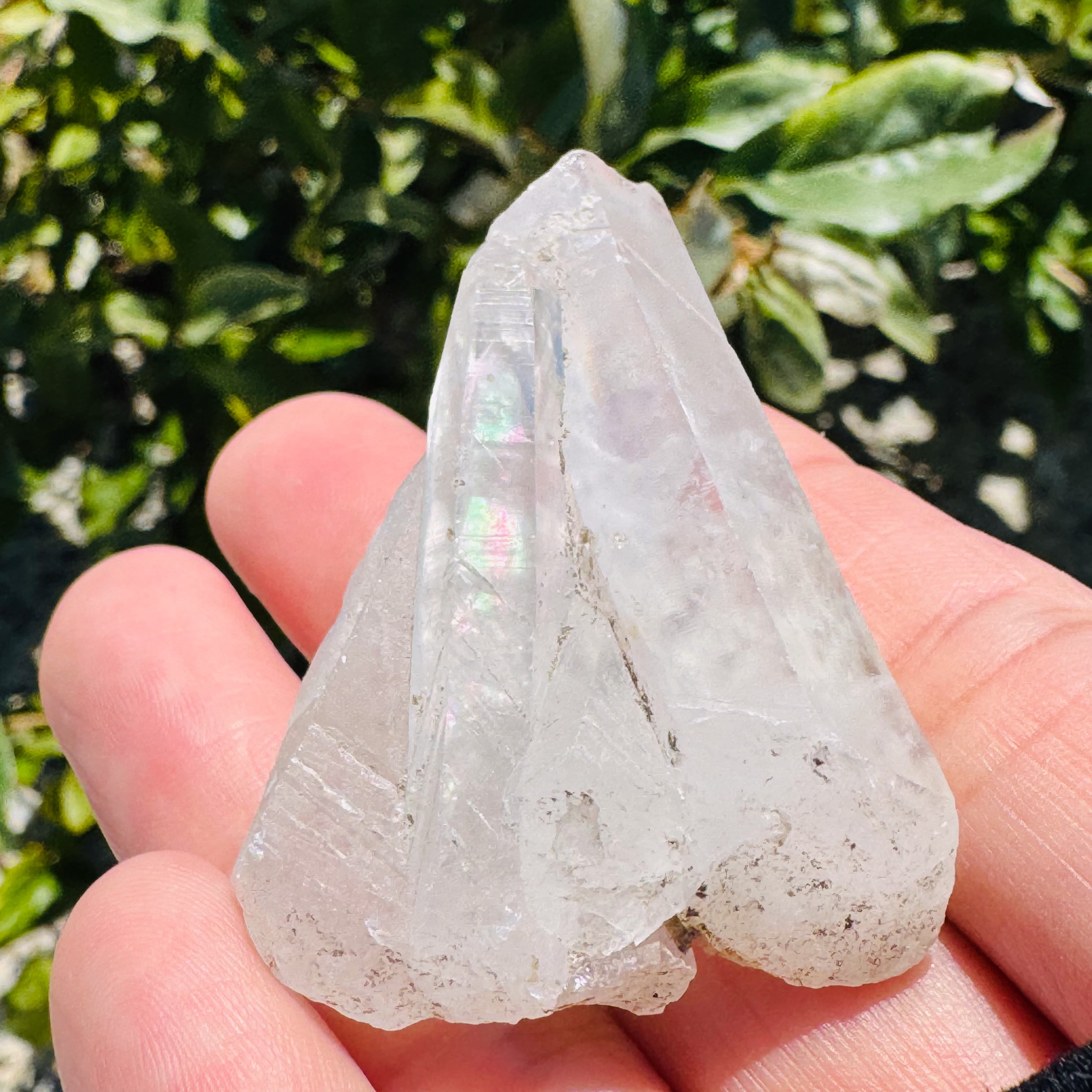 大聖堂を思わせる色々な形の集合体の原石です。真ん中に大きな虹が見え、白さと透明度もあります。
