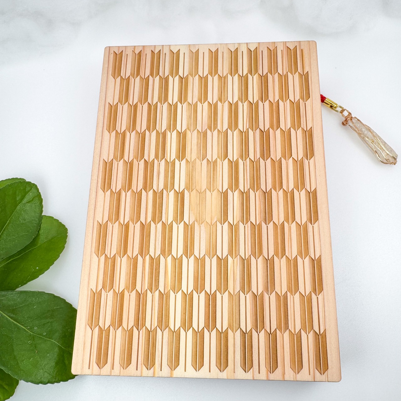 ✅表紙中央には神域を守るしめ縄、まわりに「矢絣(やすがり)」がデザインされています。木製ならではの温かみのある手触りが心地よいです。