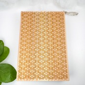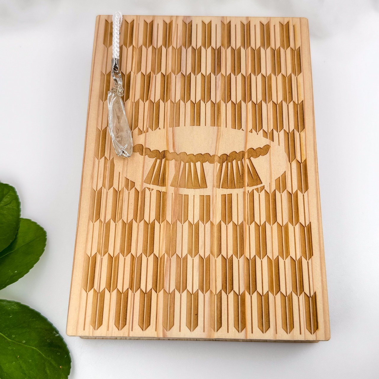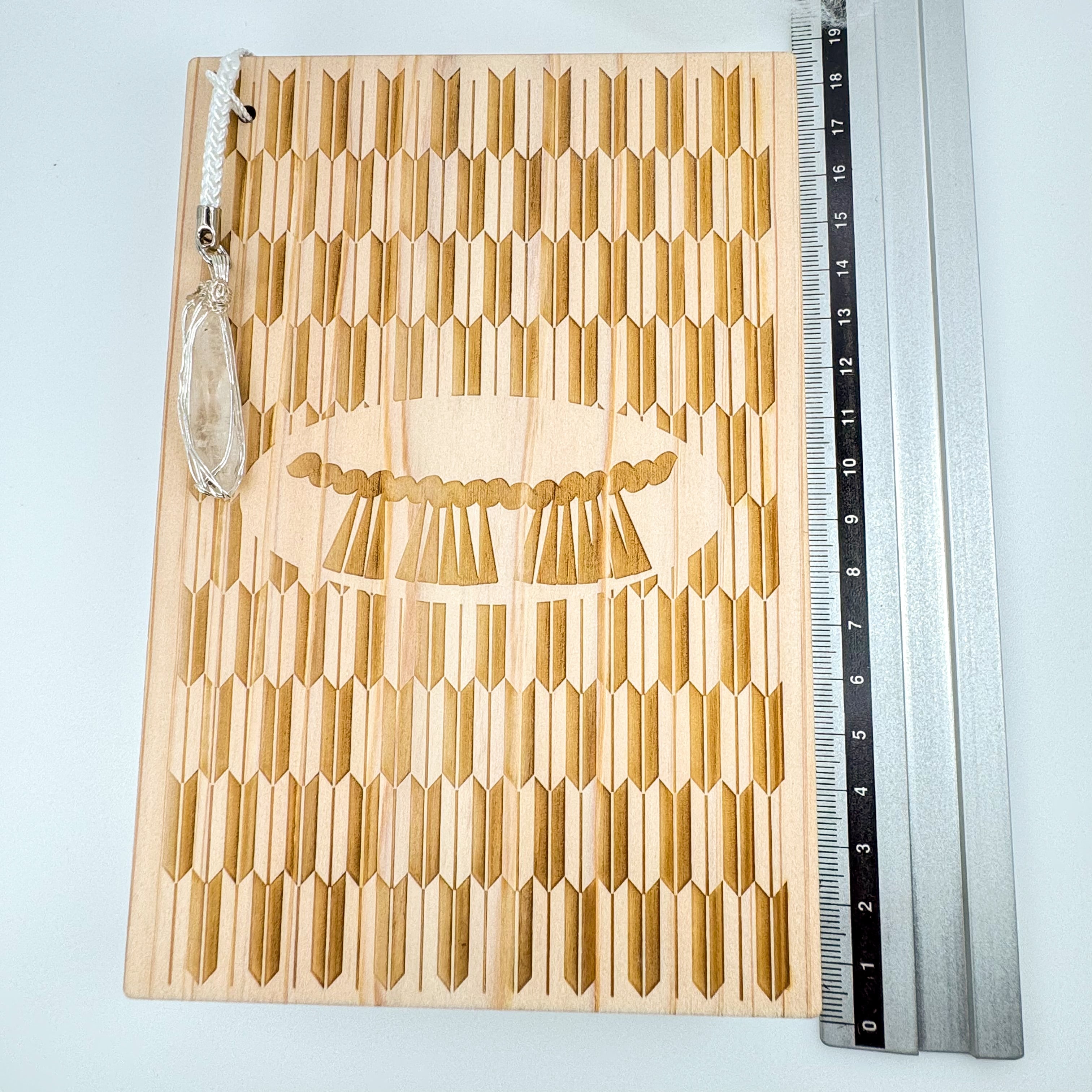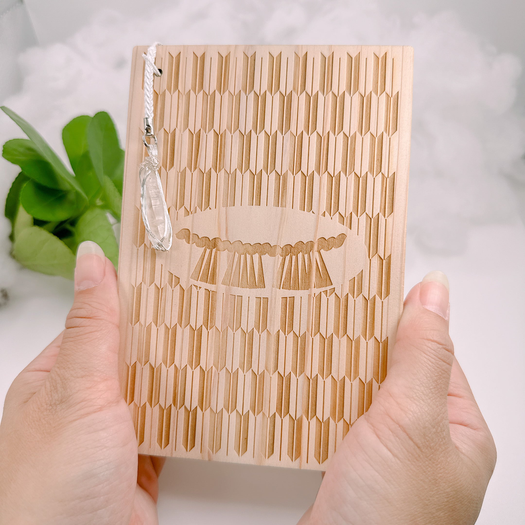 ✅表紙中央には神域を守るしめ縄、まわりに「矢絣(やすがり)」、裏側には「花菱(はなびし)」がデザインされています。木製ならではの温かみのある手触りが心地よいです。
