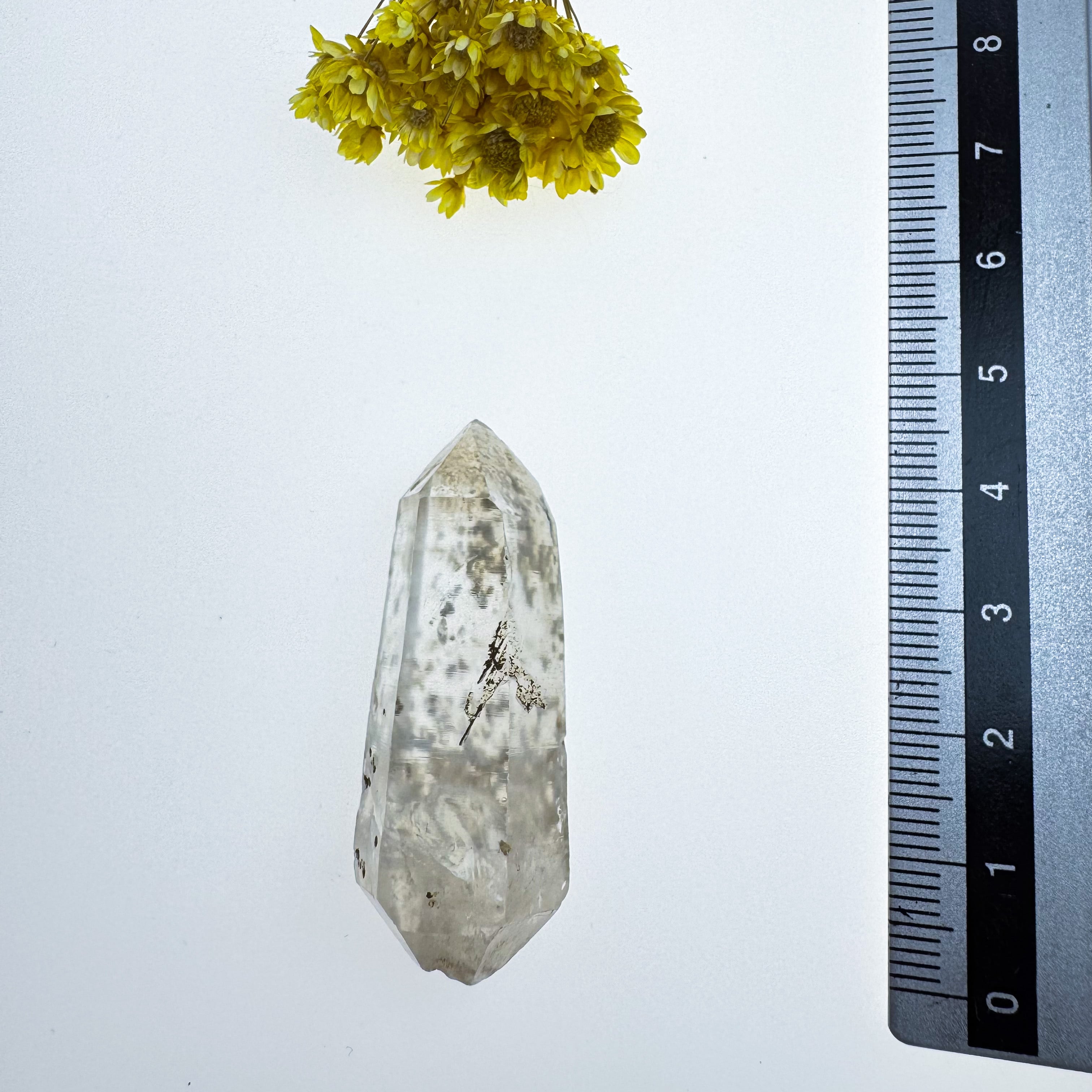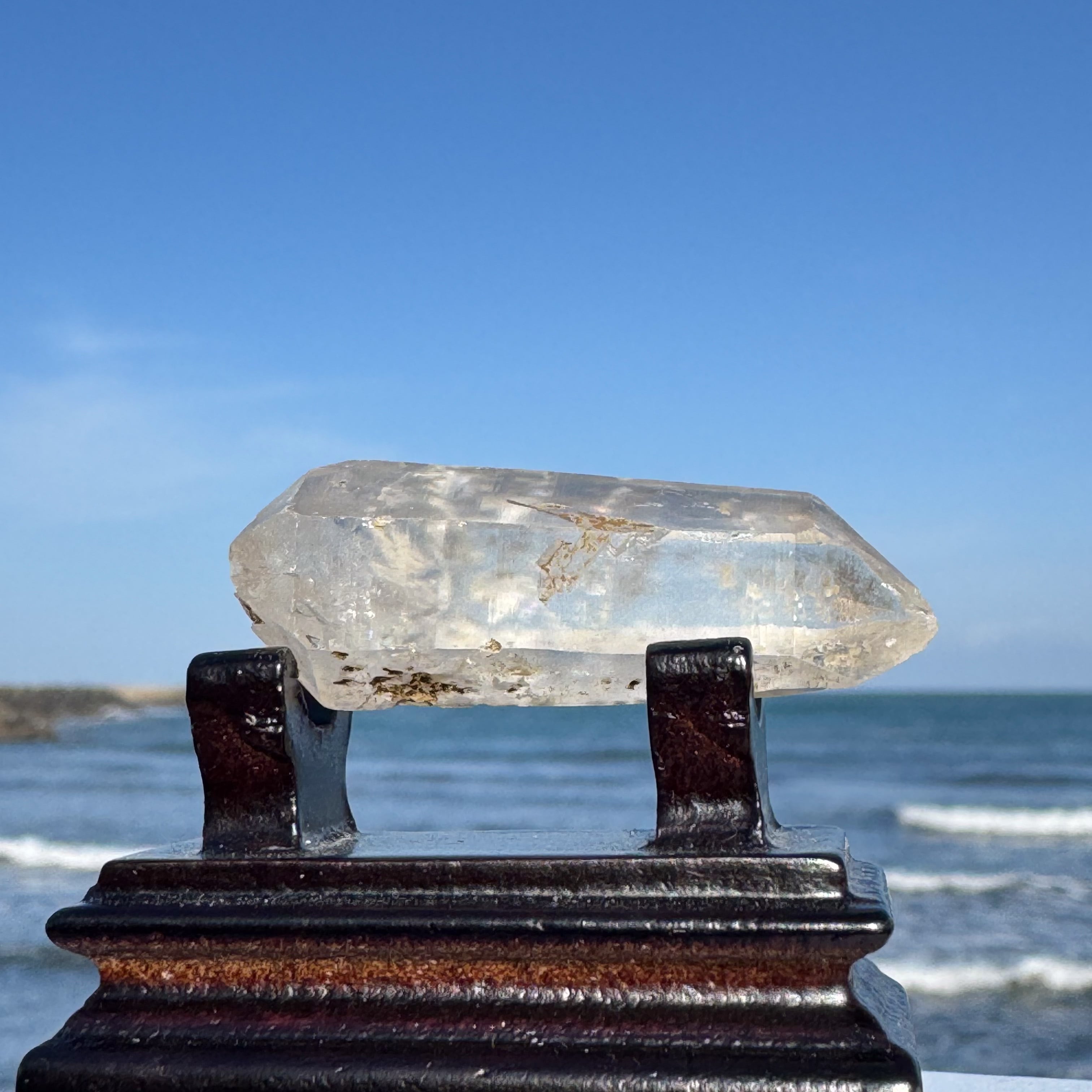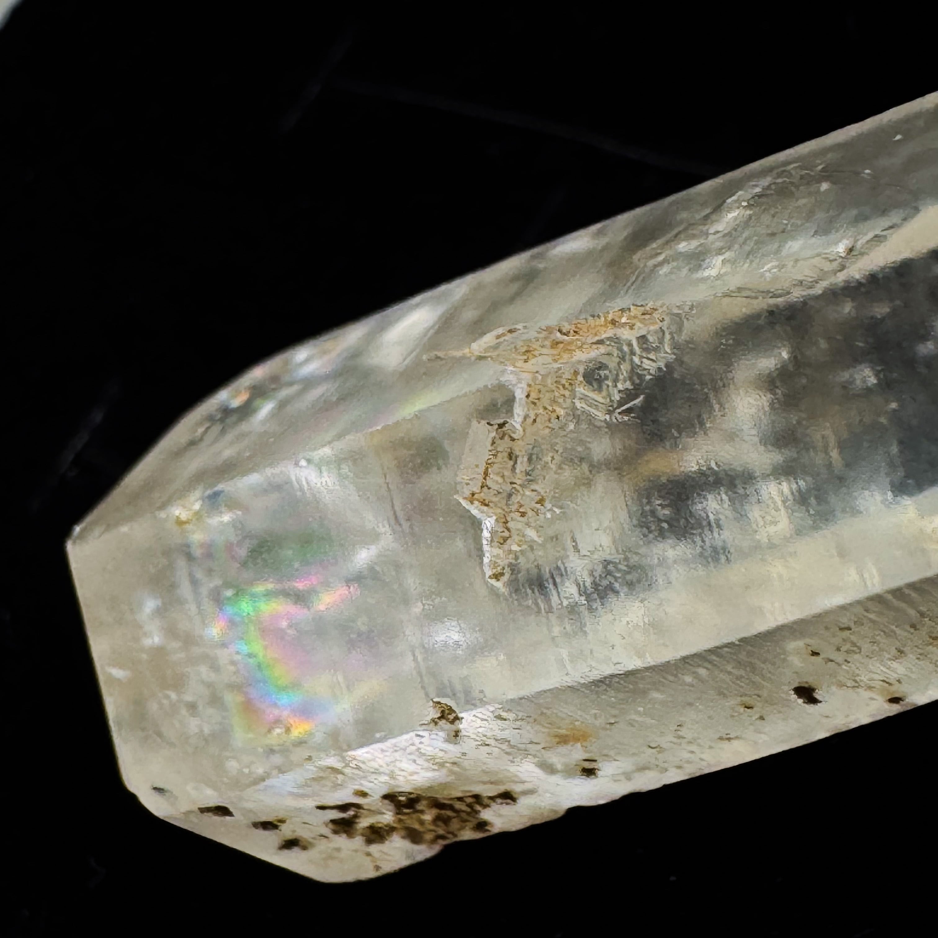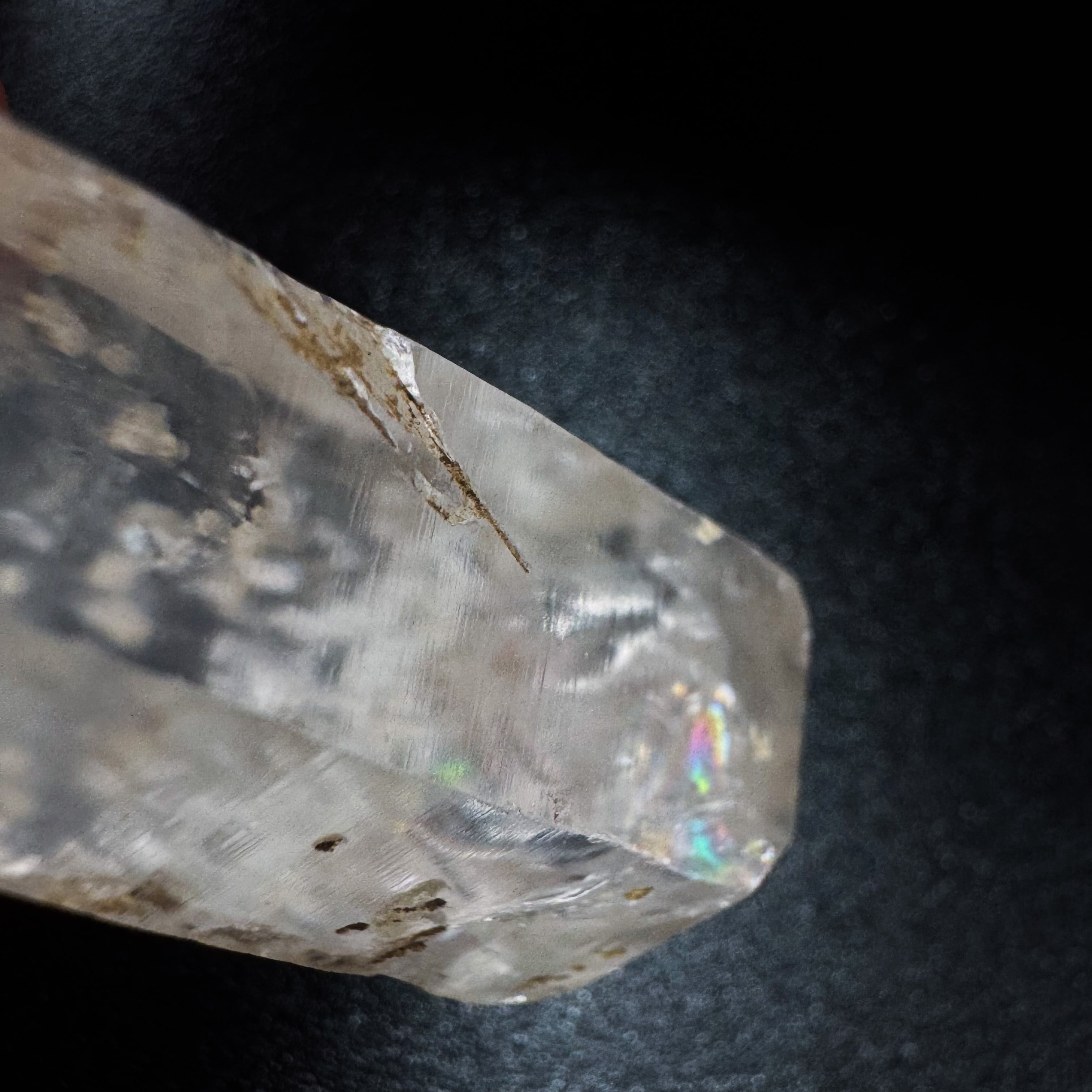 水晶の中央部分に大きな「虹入り」の特徴を持っています。水晶の中にクラッツ(ひび割れ)を持ち、光の当たり方によって虹の輝きを放っています(画像5・6枚目)。