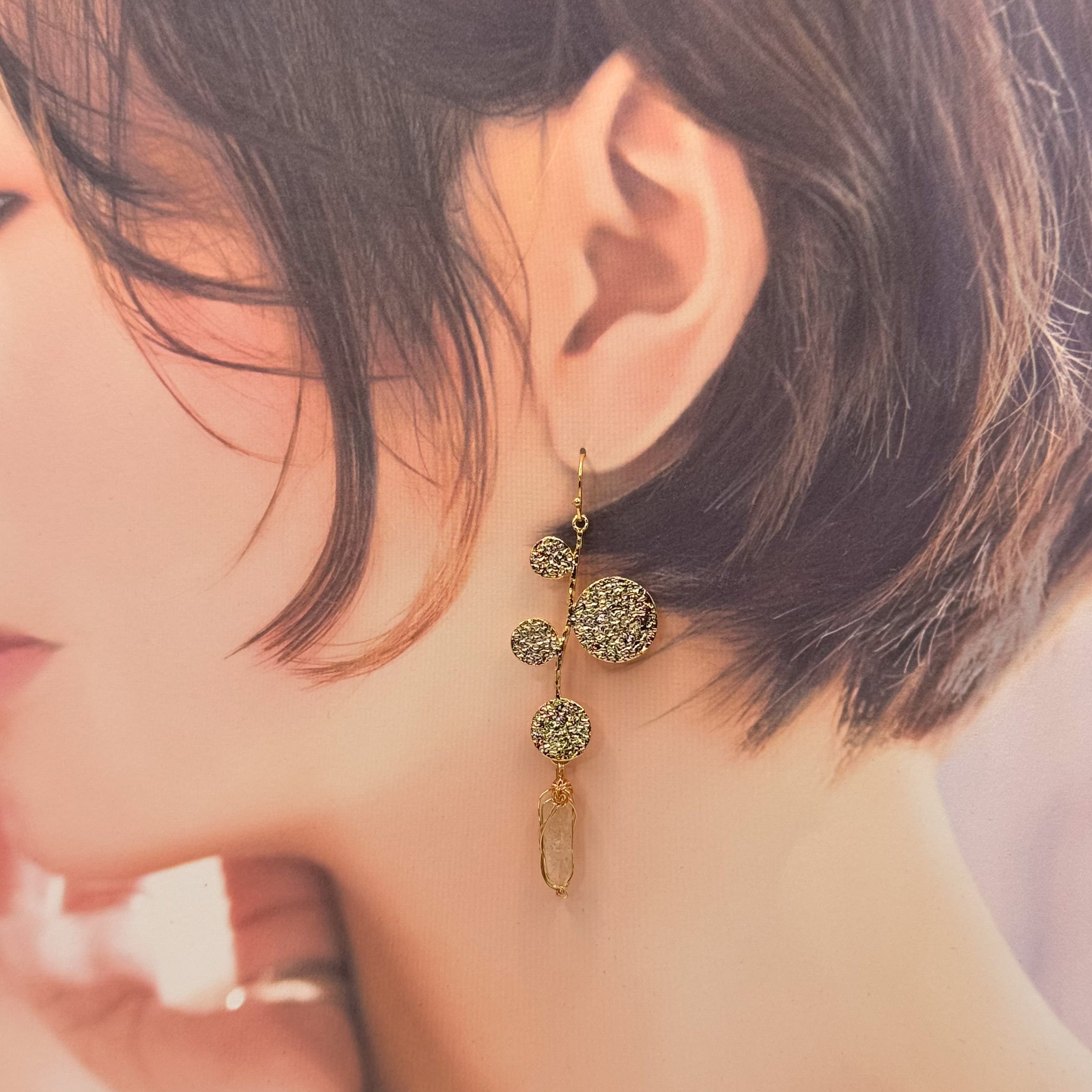 ✅大小の丸モチーフが印象的なパーツを使っています。丸いメタルパーツの凸凹感もステキです。耳元で華やかさを与えてくれます。