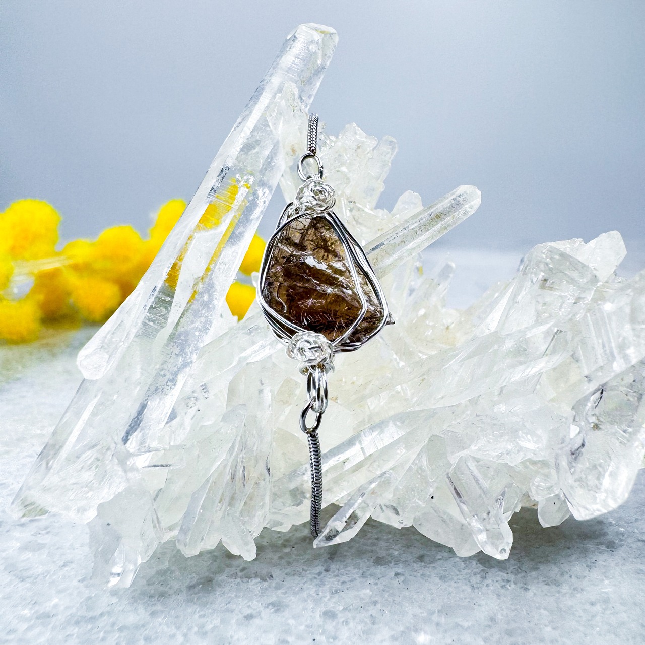 自然の放射線が一定期間、長い年月をかけて土の中の水晶に当たり続けることで黒くなっていきます。小さな虹入りの特徴が見えます(6枚目参照)