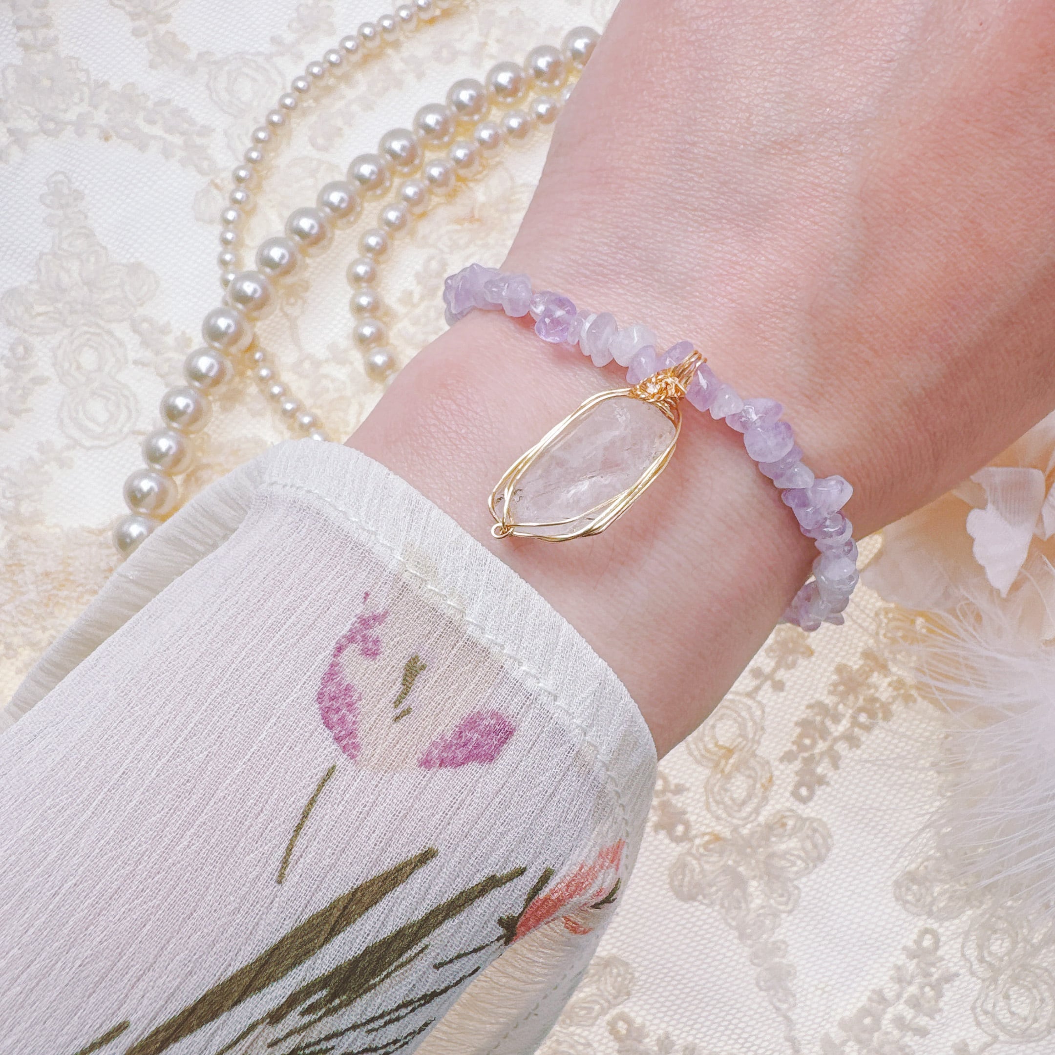 ✅ラベンダーアメジストのさざれ石を組み合わせています。淡い紫色のアメジストは、癒し・心の安定感を与えてくれます。見ているだけで癒される印象です。