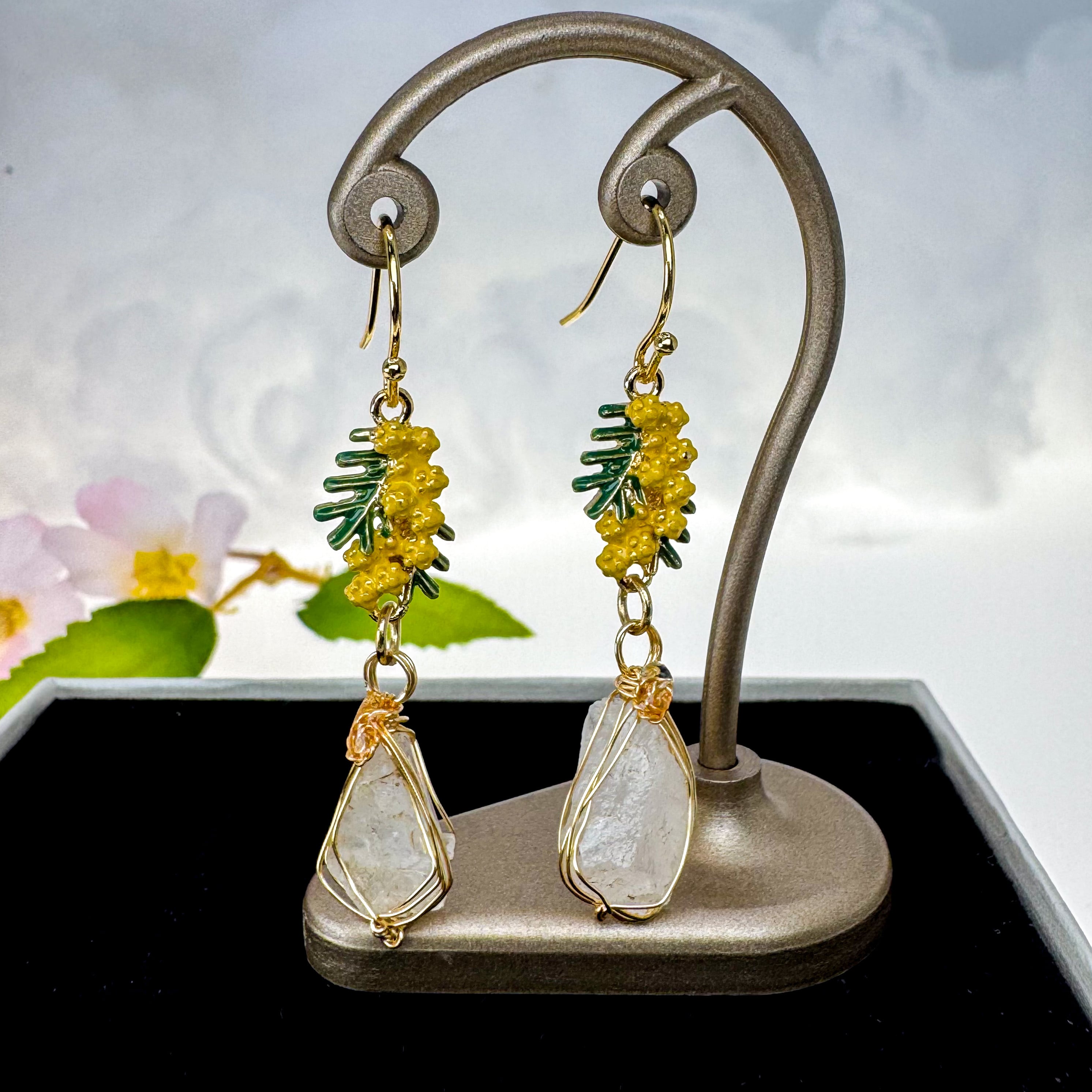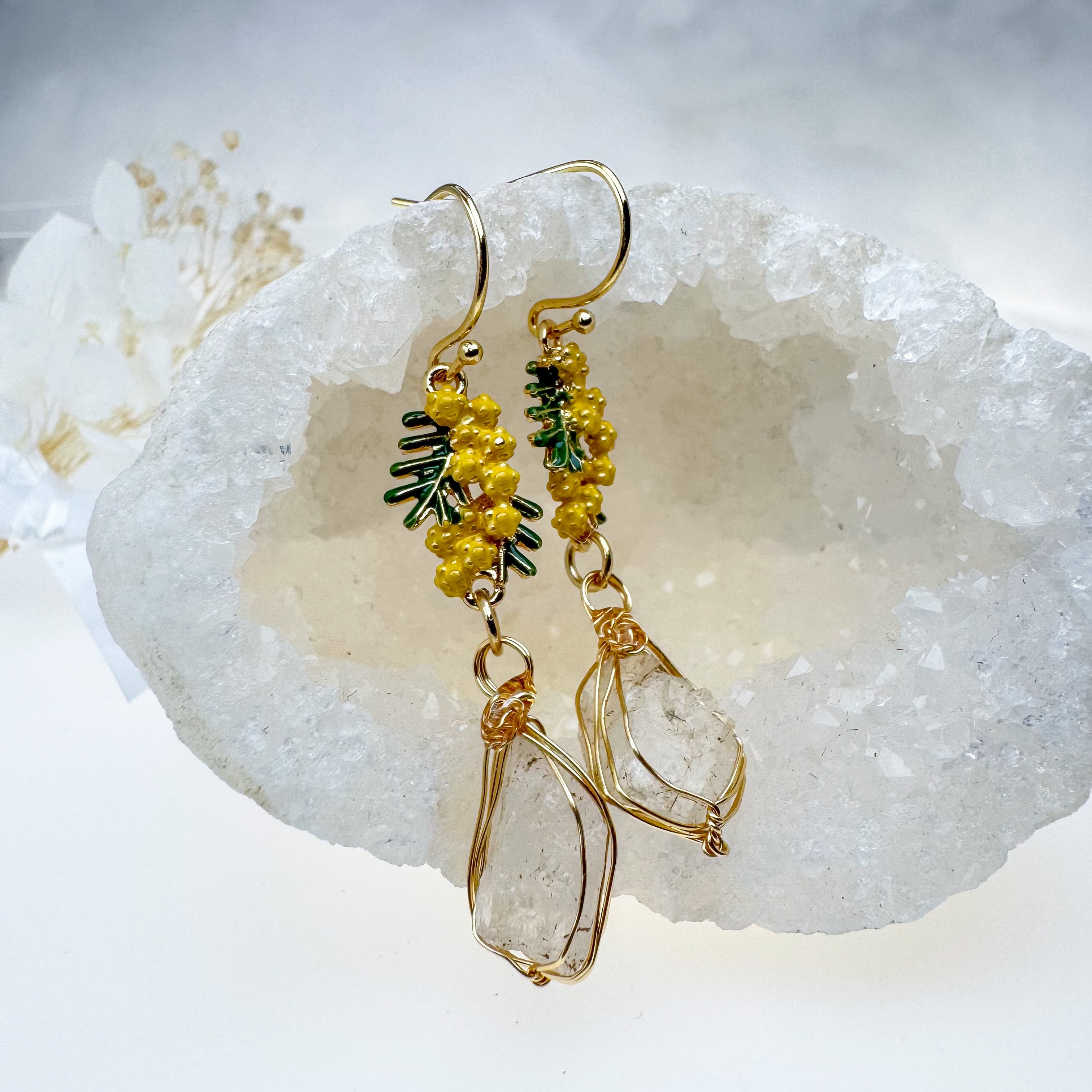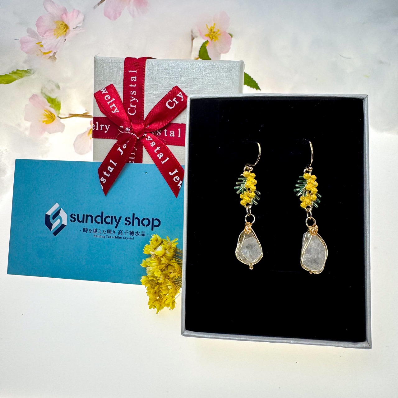 ✅キラリと輝く高千穂水晶とミモザのモチーフを組合せています。春のお出かけや特別な日に、耳元にやさしい彩りを与えてくれます。