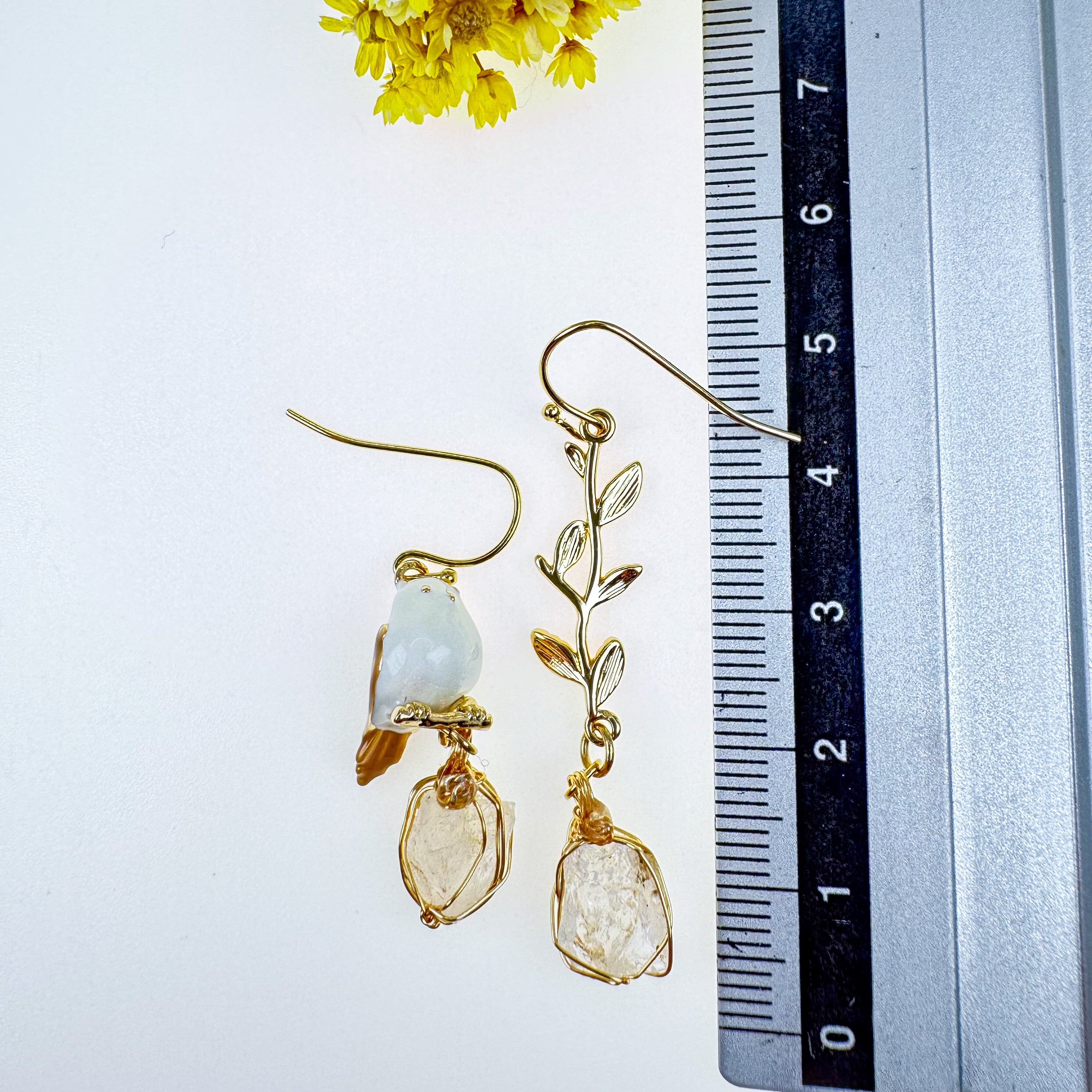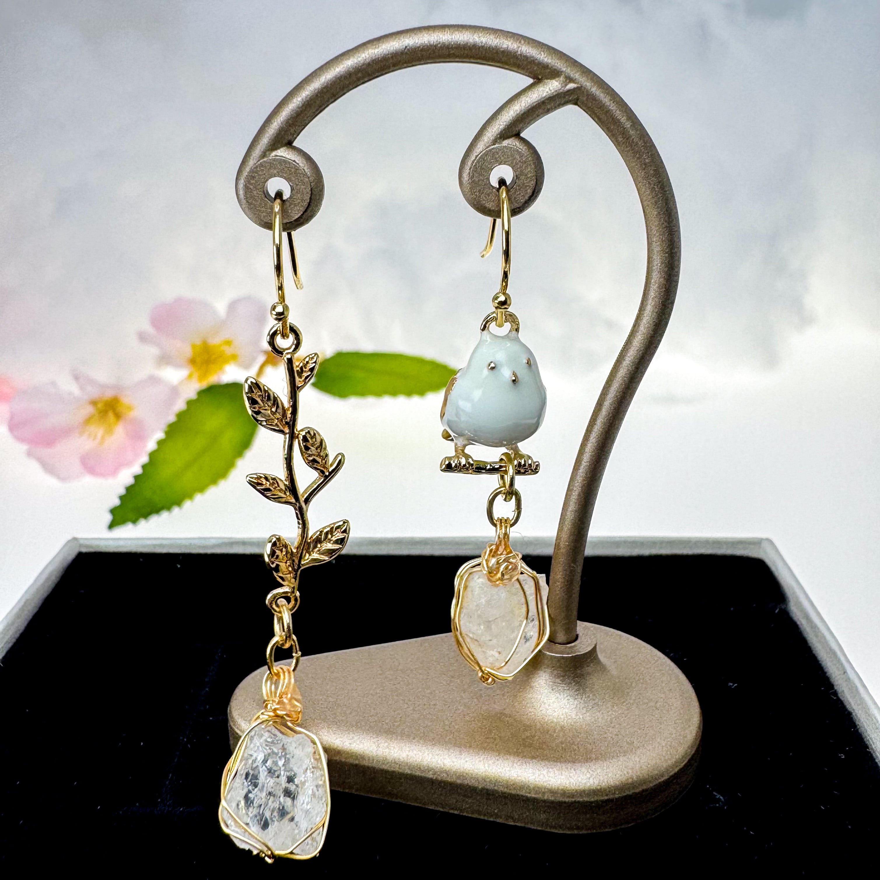 ✅片耳ごとにモチーフの組合せを変えています。かわいいシマエナガのモチーフと、耳元で揺れるリーフ、遊び心のある見た目も魅力的です。