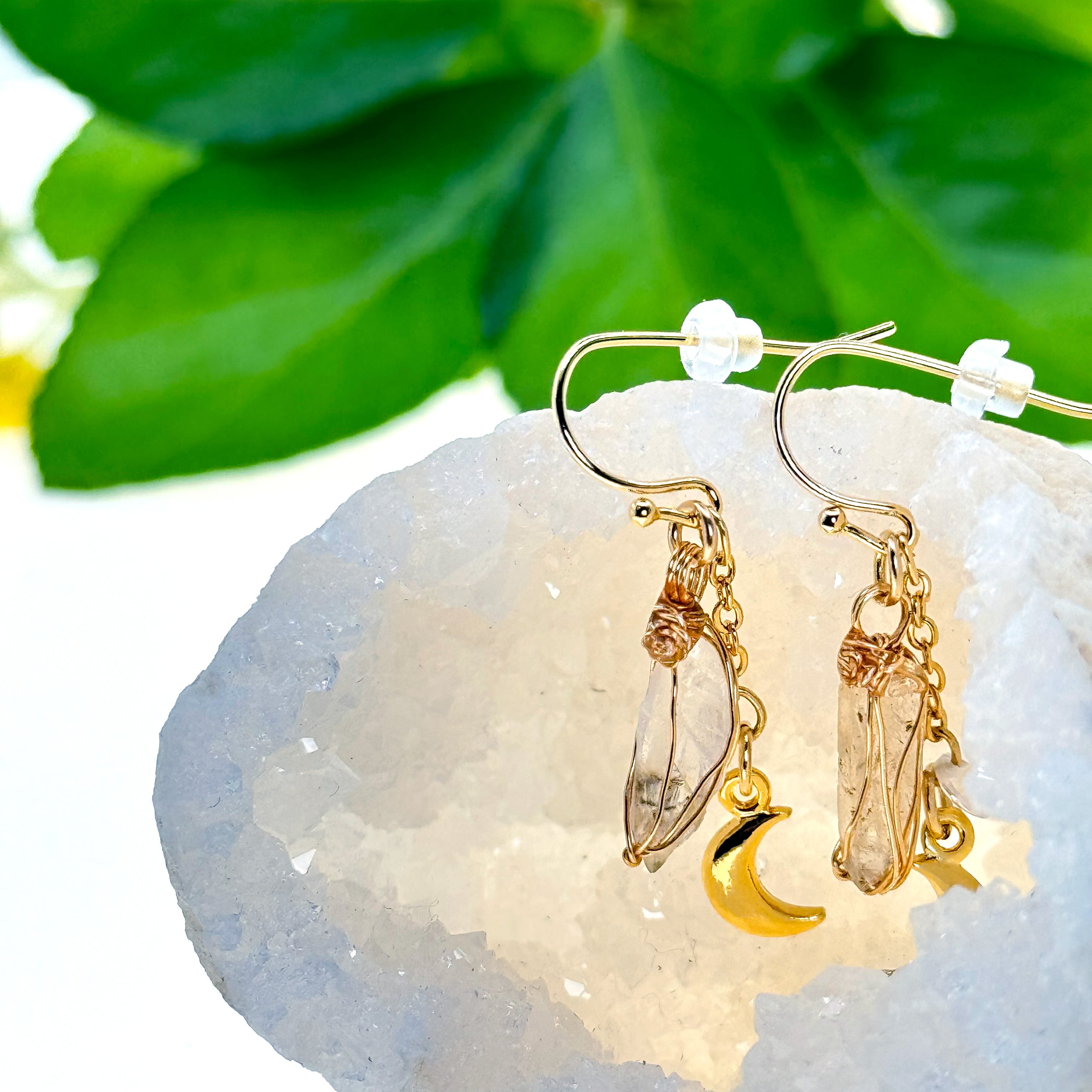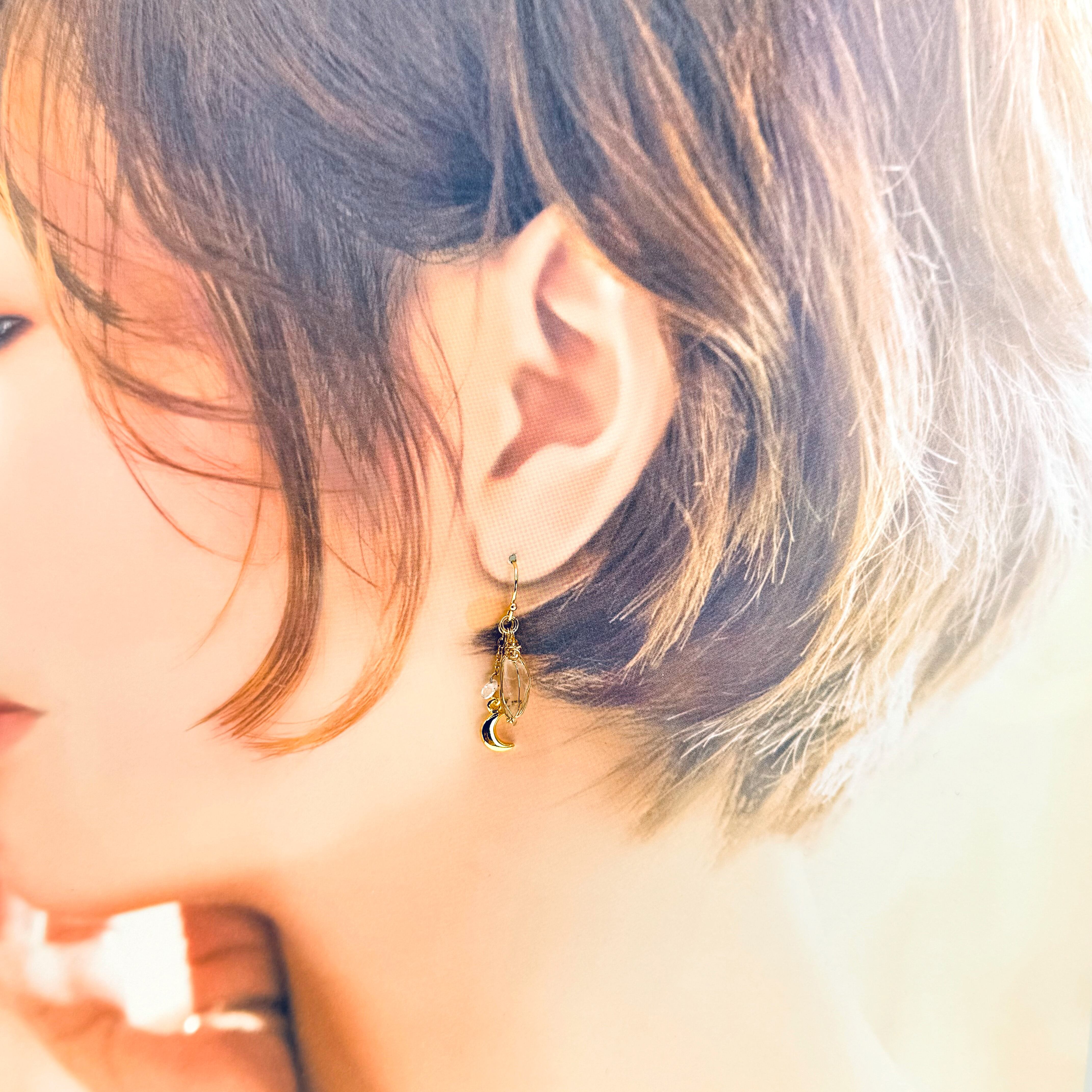 ✅月のモチーフを組み合わせています。耳元で揺れる高千穂水晶がきらりと輝きを放ちます。